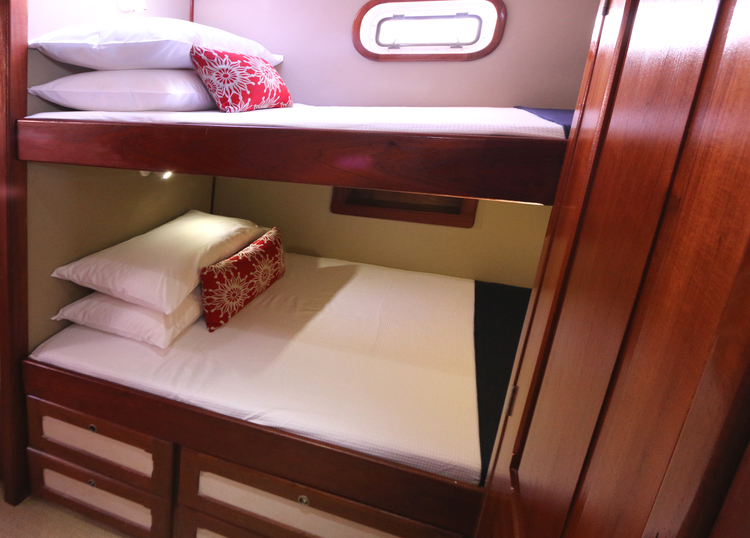 The vessel can comfortably sleep up to 4 guests across 2 cabins for overnight or multi-day trips and boasts a large interior saloon and multiple outdoor areas for soaking up the sunshine and fresh air.